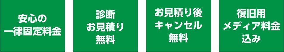 当社のデータ復旧サービスは、お客様に安心してご利用いただけるよう、3段階の障害レベルを設定し、一律固定料金制にてご注文を承っています。必ず事前にメディアの診断を行い、障害レベルとお見積りをご提示し、ご納得いただいてから作業を行います。診断・お見積りは無料で、お見積り後に作業を行わない場合もキャンセル料はいただきません。復旧用のメディアの代金も復旧料金に含まれており、作業後に追加料金が発生する心配がありません。